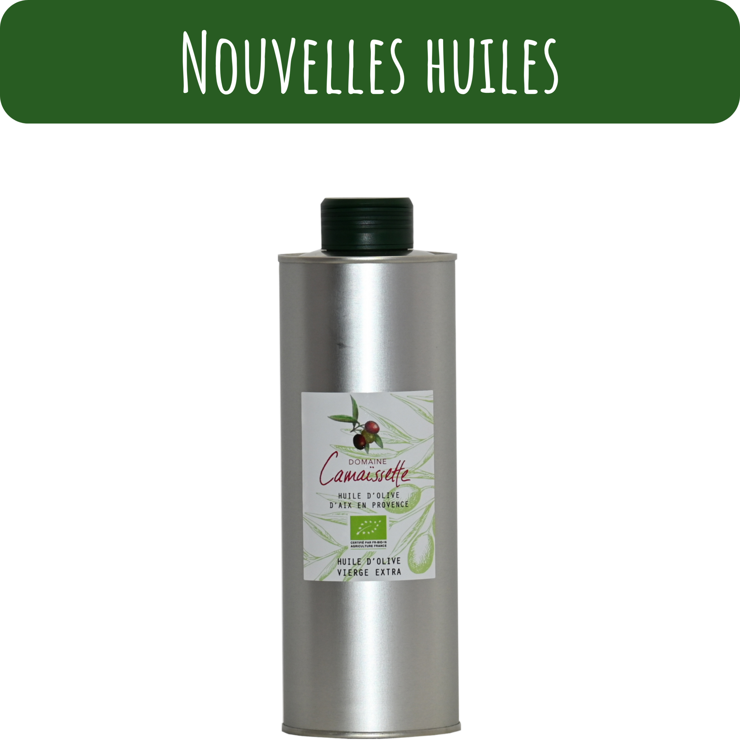Huile d’Olive AOP d’Aix-en-Provence est composée des variétés Salonenque, Aglandau, avec une touche de Grossanne et de Picholine.