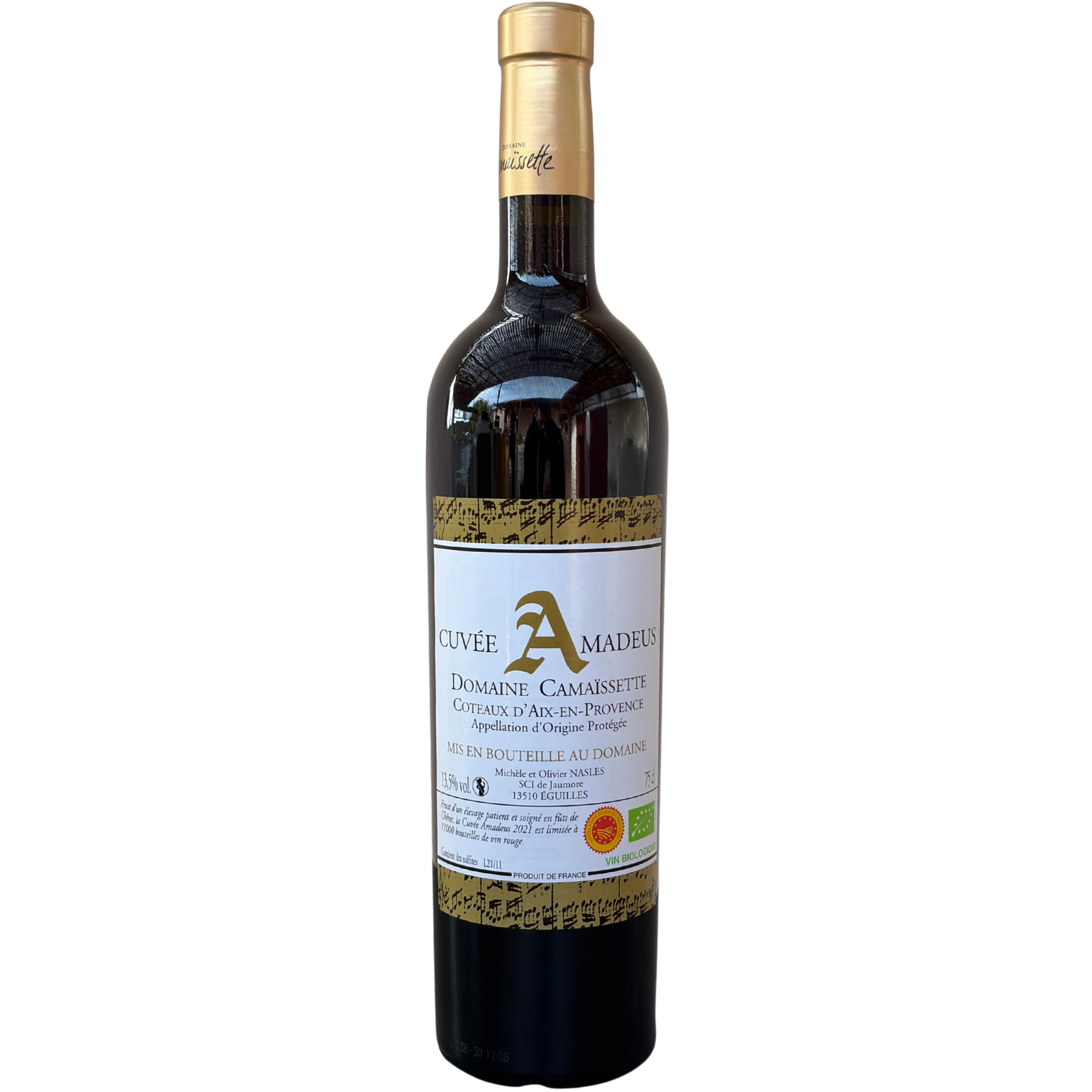 La cuvée Amadeus Rouge Bio se marie parfaitement avec les viandes rouges et les gibiers, mais aussi avec les plats de viandes en sauces ou le magret de canard et les fromages forts. La température optimale de dégustation de la cuvée Amadeus Rouge Bio se situe entre 16° et 18°. Les vins du Domaine Camaïssette sont labellisés AOP Coteaux d’Aix-en-Provence et Agriculture Biologique.       La cuvée AMADEUS est née en hommage à Wolfgang Amadeus Mozart, génie de la musique et emblème du Festival International d’Art Lyrique d’Aix-en-Provence. Portée sur les fonts baptismaux, il y a plus de 30 ans par le baryton Gabriel Bacquier, Cette cuvée existe dans les 3 couleurs. Le blanc et le rosé sont vinifiés dans le respect de la technique bourguignonne, fermentés et élevés durant 12 mois en fûts de chêne. Le rouge, élaboré à base de Syrah et de Cabernet-Sauvignon, bénéficie d’un passage en barrique d’au moins 18 mois. Cette Cuvée a la particularité d’être capable de se bonifier au fil du temps. Découvrez des blancs et des rosés qui ont plus de 15 ans ! Nous élevons nos vins pour vous les proposer prêt à boire.