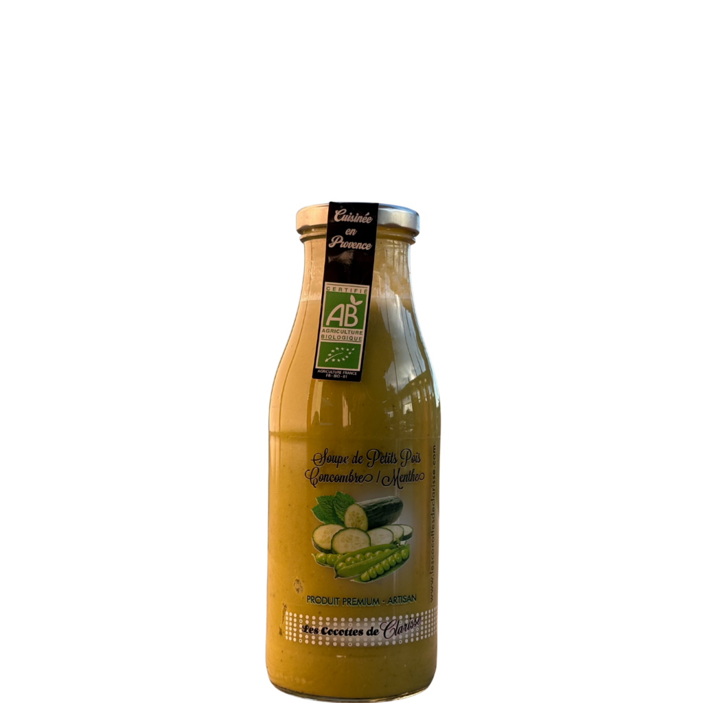 Les petits pois apportent douceur et rondeur, le concombre une touche de fraîcheur, tandis que la menthe vient subtilement parfumer l’ensemble. Cuisinée en Provence, cette soupe est sans conservateurs, sans gluten et certifiée Agriculture Biologique (AB).